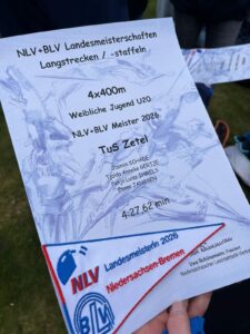 Die U20-Staffel über 4×400 Meter sicherte sich in einer starken persönlichen Bestzeit von 4:27,62 Minuten den Landesmeistertitel. Damit krönten die Zetelerinnen einen rundum gelungenen Wettkampftag. Bereits zuvor hatte die U18-Langstaffel über 3×800 Meter mit Fenja Ihmels, Tjalda Gertje und Emma Janssen einen hervorragenden dritten Platz belegt, nur geschlagen von den Teams aus Bremervörde und Braunschweig.