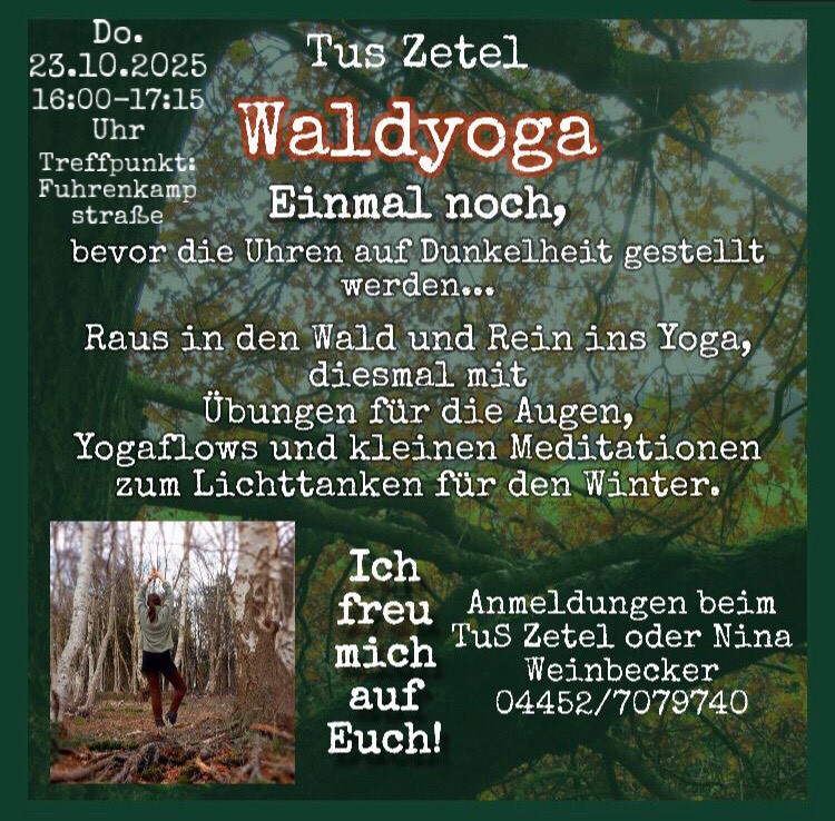 Am kommenden Sonntag den 22.06.2025 bietet der TuS Zetel eine kleine KUNDALINI Yogawanderung im Fuhrenkamp an. Unser Thema ist „Tragen und Loslassen“, Verspannungen lösen, Ursachen forschen und passend zur Sommersonnenwende ein paar Dinge hinter sich lassen und neue Wege finden.